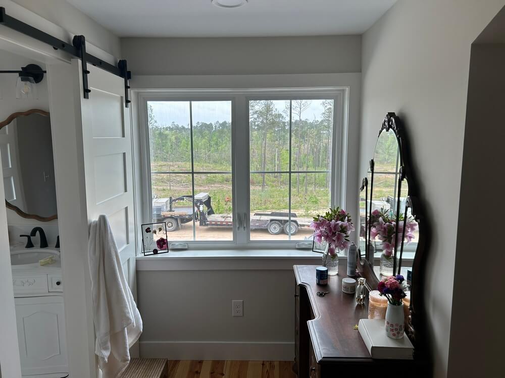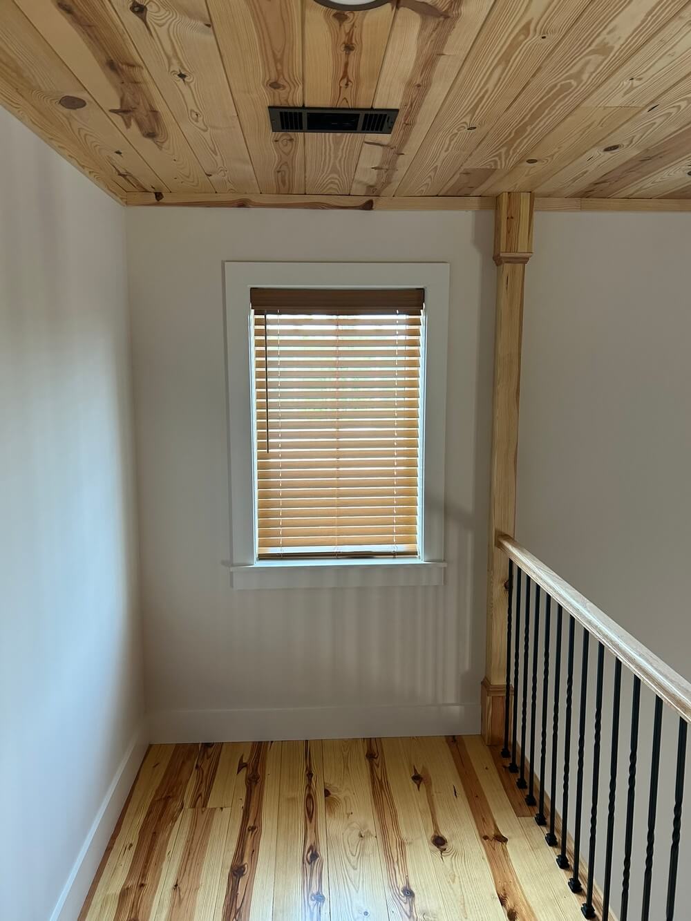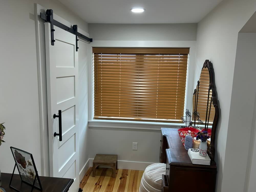 We help a lot of people make their homes beautiful with custom faux wood blinds, and it's always a great pleasure getting to design a project that accents the best aspects of our customer's homes. For this project, we were able to use elegant oak woodgrain faux wood blinds to match the rustic and attractive wood interiors sourced from the land this new farm and ranch house is built upon in Edgefield, SC. A popular option for this kind of project is all wood blinds, which provide a classic wood grain décor, but these top of the line faux wood blinds use an attractive new technology woodgrain print from CACO Window Fashions that are virtually indistinguishable from 100% wood yet is more resistant to warpage and chemicals and a more cost effective alternative.