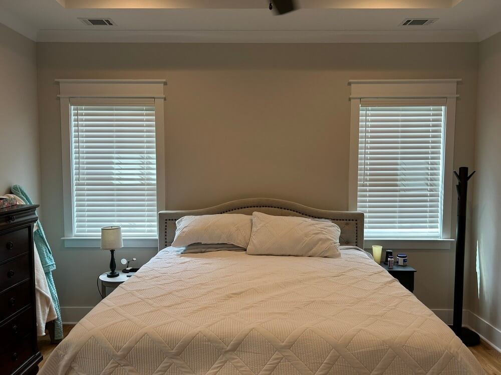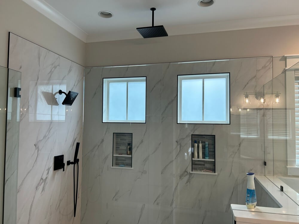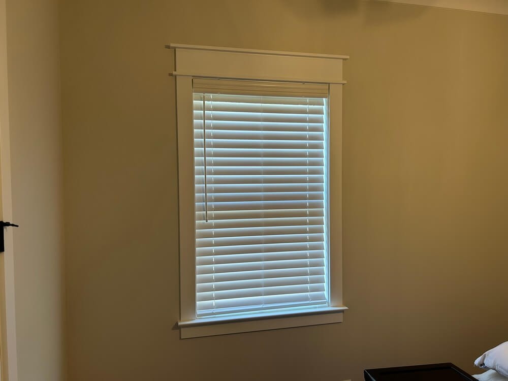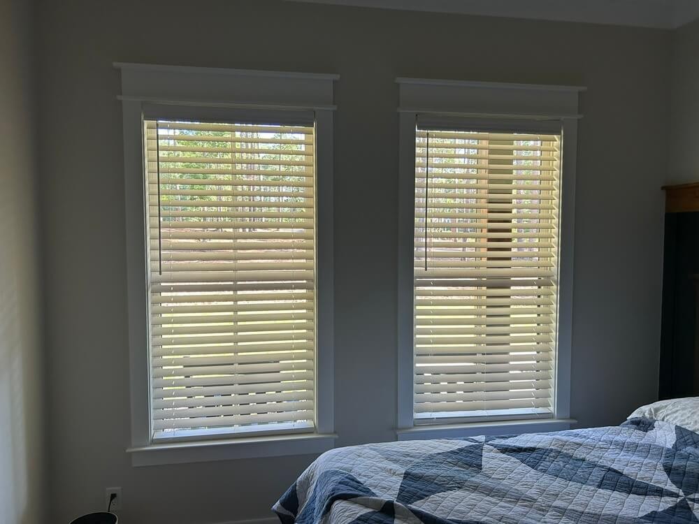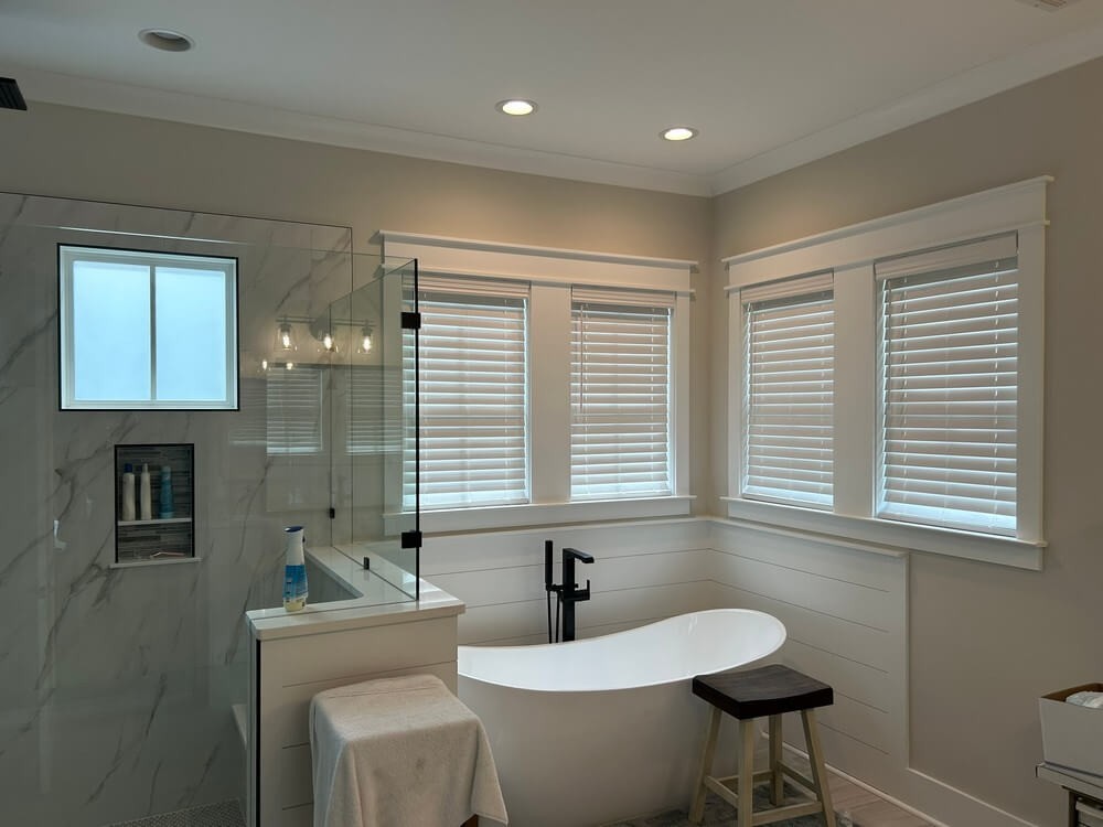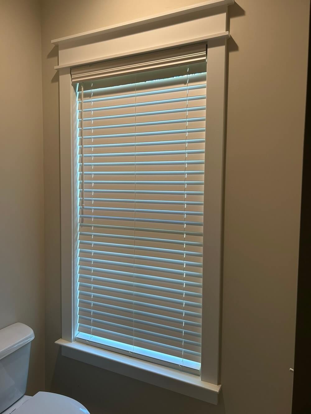Sometimes you may want something different than common 2" faux wood blinds, and shades or plantation shutters are a beautiful alternative but may be more of an investment than many people are ready to make in Appling, GA. 2 1/2" blinds are a great choice to get a stylish look similar to shutters, which commonly have 2 1/2" louvers, and still get the ease and affordability of blinds. It's also quite common to have bathroom windows that lack privacy, but you may not want to put blinds, shades or shutters in a very high humidity area like a shower. For this project we installed some very stylish yet affordable 2 1/2" faux wood blinds made by Royal Windows for a beautiful new house, and applied frosted glass privacy tint to the master bath shower windows.